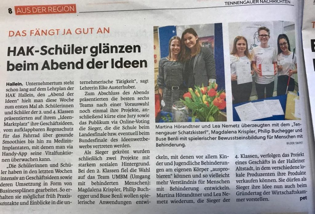 Abend der Ideen an der HAK Hallein 1 21 März, 2019 in News von Elke Austerhuber (vor 2441 Tagen aktualisiert) Link: www.sn.at/salzburg/chronik/hak-hallein-schueler-glaenzen-beim-abend-der-ideen-67187527